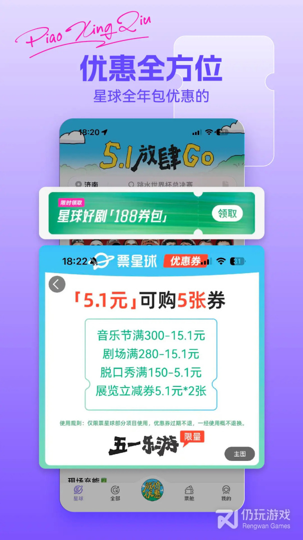 票星球是为用户们提供各种演出现场票务售卖服务的平台。你可以在这里购买到包括:演唱会、展览会、体育比赛、戏曲歌剧、相声话剧等各种活动的门票。通过软件来一键搜寻你要购买的门票,进行在线预订和购买,更有超多优惠券为你节省大量花费。