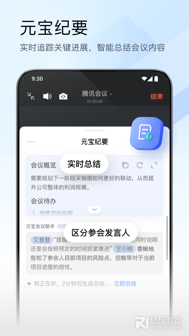 会中开启转写,支持实时精准翻译和元宝纪要总结。