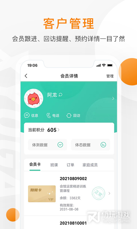 会员管理:会员及访客信息管理;体验卡、会员卡管理。