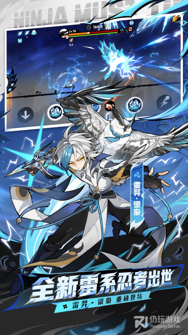 忍术•烈雷爆丸:阿力召唤一个雷球从自身位置向前推进,雷球越搓越大(搓球阶段雷球处于阿力前方,跟随阿力上下移动,这段时间雷球体积和伤害逐渐增大),搓球结束后阿力释放雷球,雷球向屏幕右方移动,到达屏幕右方时停留数秒后爆炸,伤害非常可观。