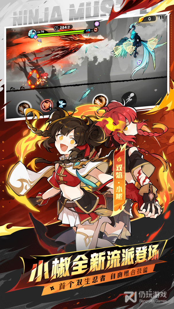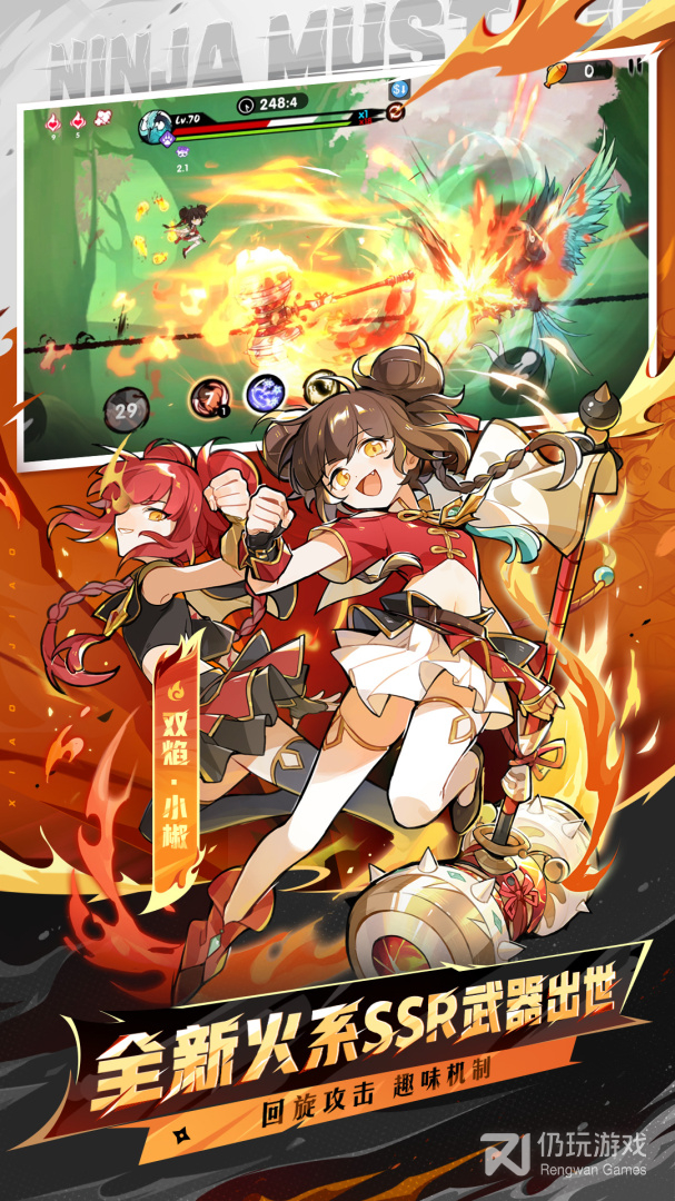 忍术•火龙炎弹:小黑召唤一堆火球环绕自身,火球自动追踪攻击目标,火球结束后召唤一个火龙卷从人物所在位置向屏幕右方推进。(注意:火球无法破坏地刺飞竹滚石镰刀等硬性障碍)