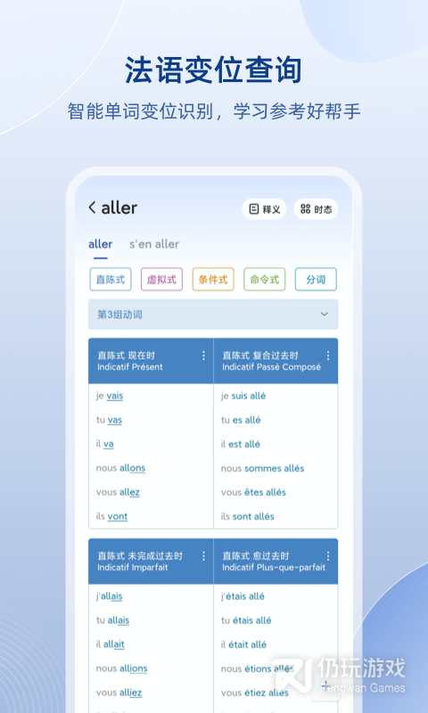 - 法语动词变位查询,提供18种时态的动词变位反查功能;