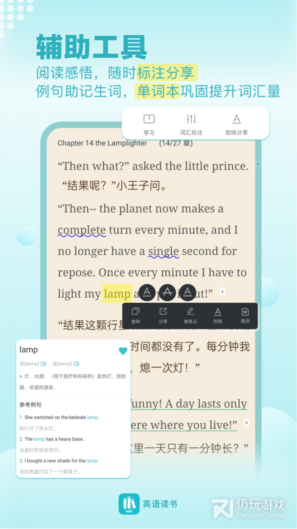 2、在阅读中,会自动加亮生词本的词汇,潜移默化帮助生词的长期记忆。