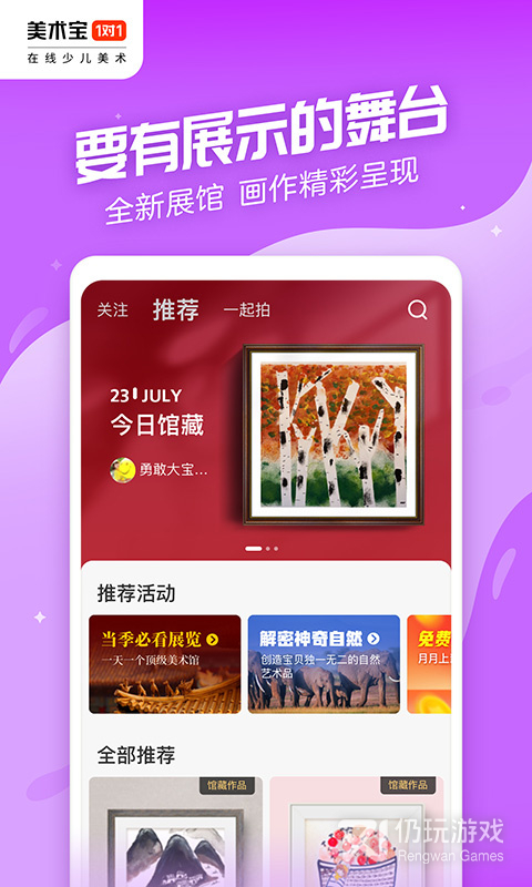 美术宝1对1是可以培养孩子们艺术细胞的在线教学软件。这里拥有专业的美术老师,为孩子提供了一对一的视频教学。这里有各种类型的绘画技巧可以学习,通过不断的学习来提高孩子的绘画能力和审美水平。软件还为孩子们提供了展馆,可以让孩子们尽情展示自己的画作。