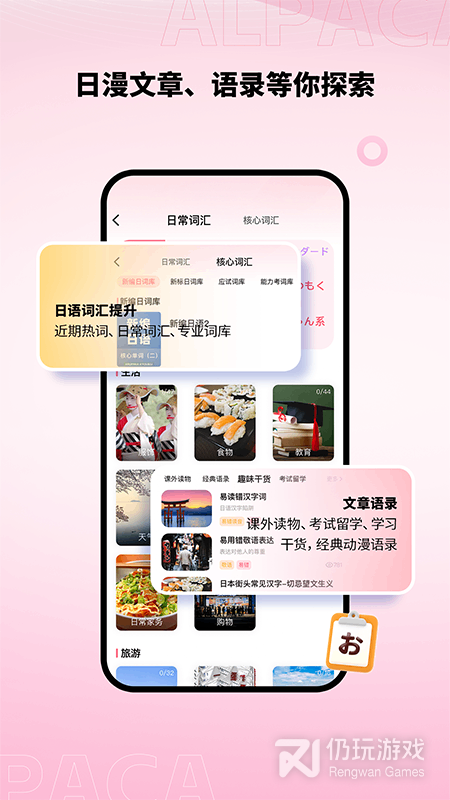 羊驼日语专为日语各个阶段学习量身打造的学习软件。日语五十音图、日语单词、日语语法……步步进阶,轻松入门学日语。