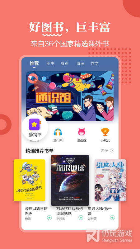 专为青少年打造的课外阅读软件,书籍资源非常丰富,各种类型书籍应有尽有。而且除了普通的文字书籍意外,还有各种有声书籍资源和漫画书籍资源,让孩子们可以拥有更多选择空间。