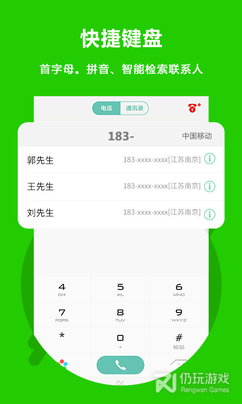 通过拨号键盘上按键1~9,可以快速按拼音或号码查找联系人并拨打电话。