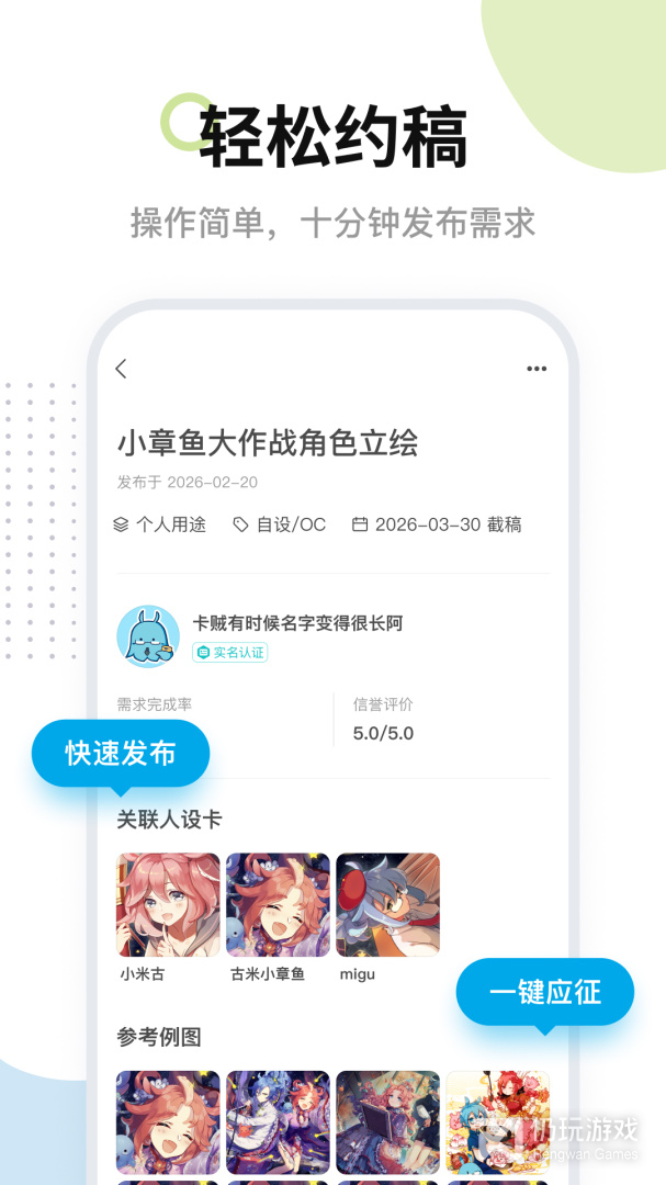 4、真实评价:画师信誉透明,每条评价均来自真实交易。完成率、准时率等多项参考值,让约稿更安心。