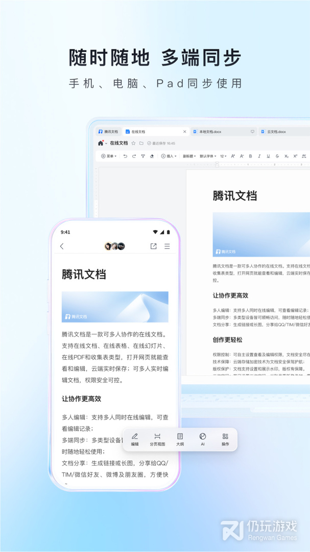 腾讯文档是一款可多人同时编辑的在线文档,支持在线Word/Excel/PPT/PDF/收集表多种类型。可以在电脑端(PC客户端、腾讯文档网页版)、移动端(腾讯文档App、腾讯文档微信/QQ小程序)、iPad等多类型设备上随时随地查看和修改文档。打开网页就能查看和编辑,云端实时保存,权限安全可控。