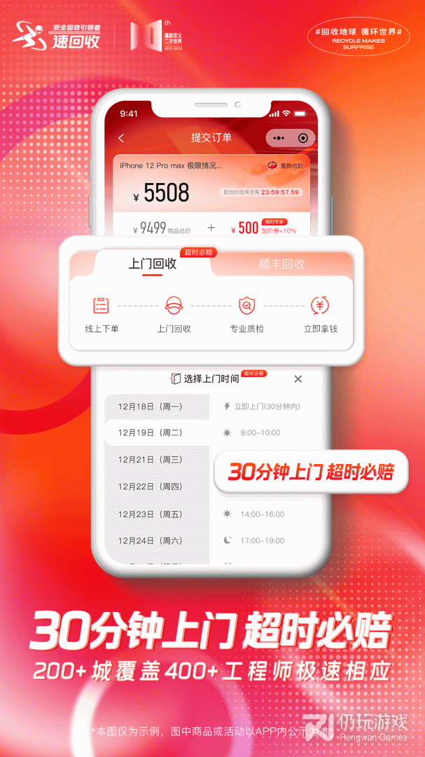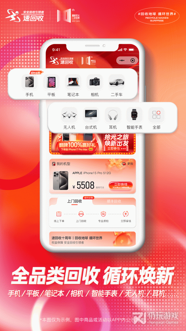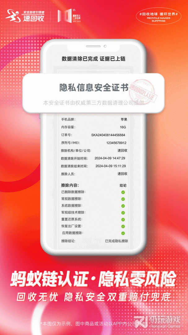 速回收App快速估价、专业质检、极速打款、全程录像可供您查看,为用户提供高质量高价的回收服务,并有数据粉碎、隐私安全保障。