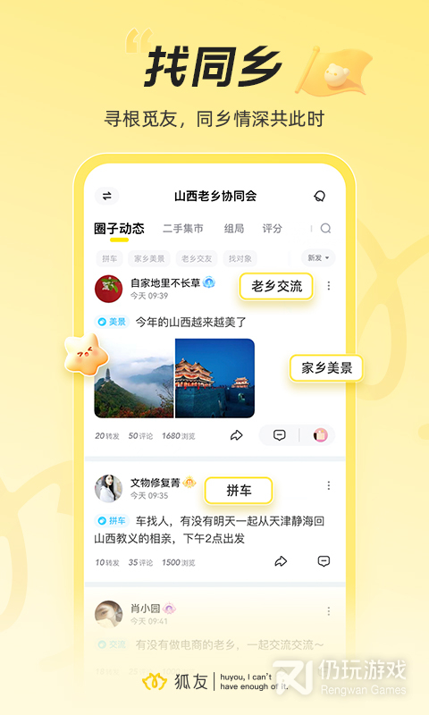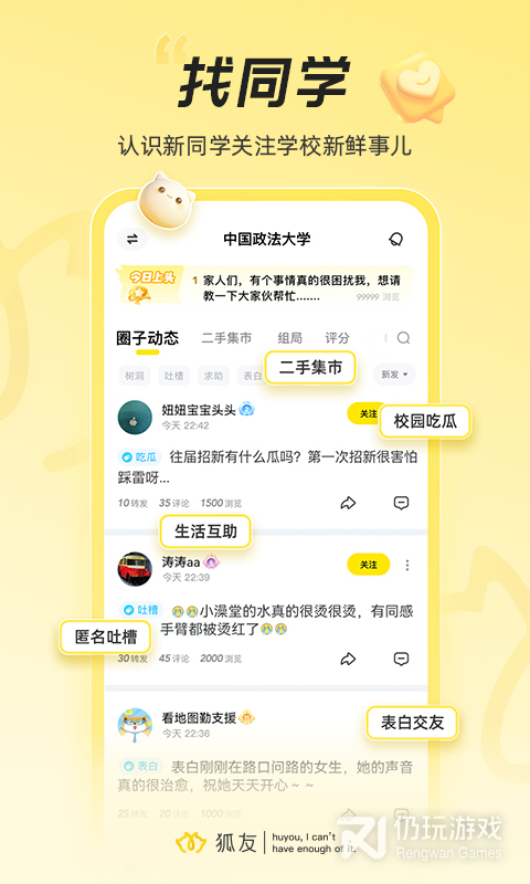 狐友是一款搜狐打造的社交APP,这里有值得关注的人,懂你的AI,这里是有温度的社交乐园,多关注,多说两句转发,你的每一个字都会有回音。