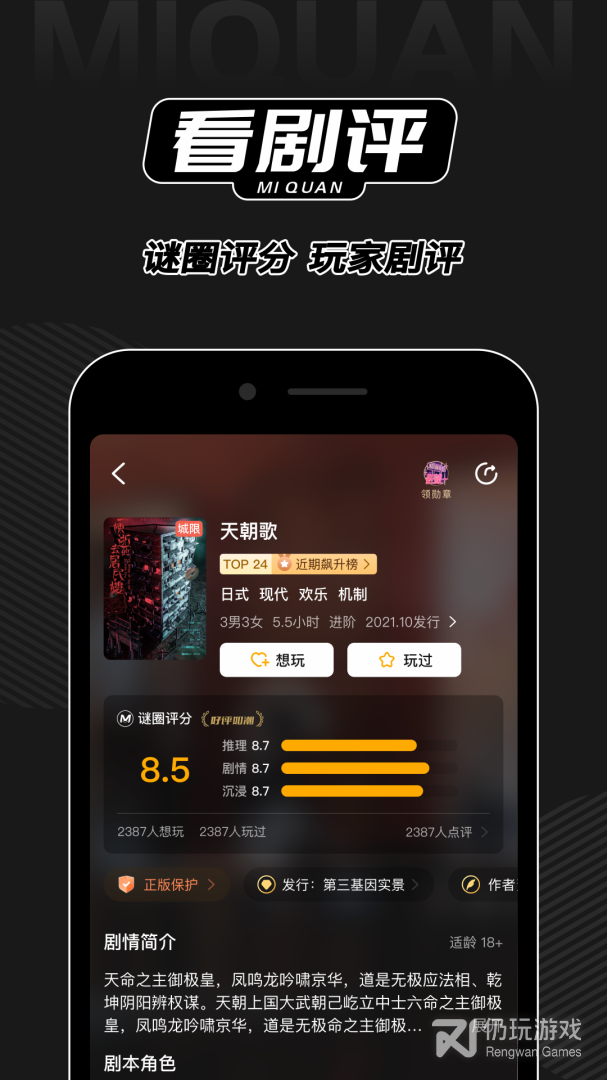 谜圈是当下非常热门的剧本杀动态资讯交流软件,你可以在这里找寻同城的剧本杀爱好者,一键进行线下约局。你也可以在这里分享自己的剧本杀感想,参与各种热门话题。除此之外,软件内每天都会更新海量优质剧本,超多热门好本等你来发掘。