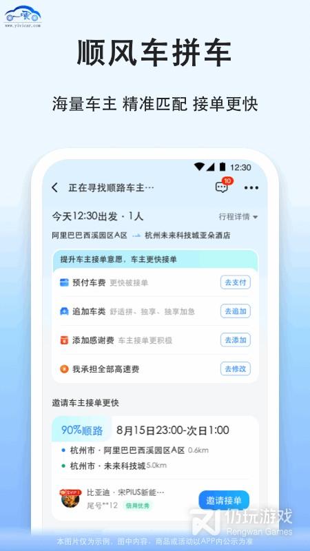 拼车不同于专车、快车的即时约车,提前发布行程,成功率更高。这里每天有数十万条全国各地的实时拼车信息,一键报警,行程分享,让您出行更安全。同城拼车、旅游拼车,是你居家、旅行之必备APP。