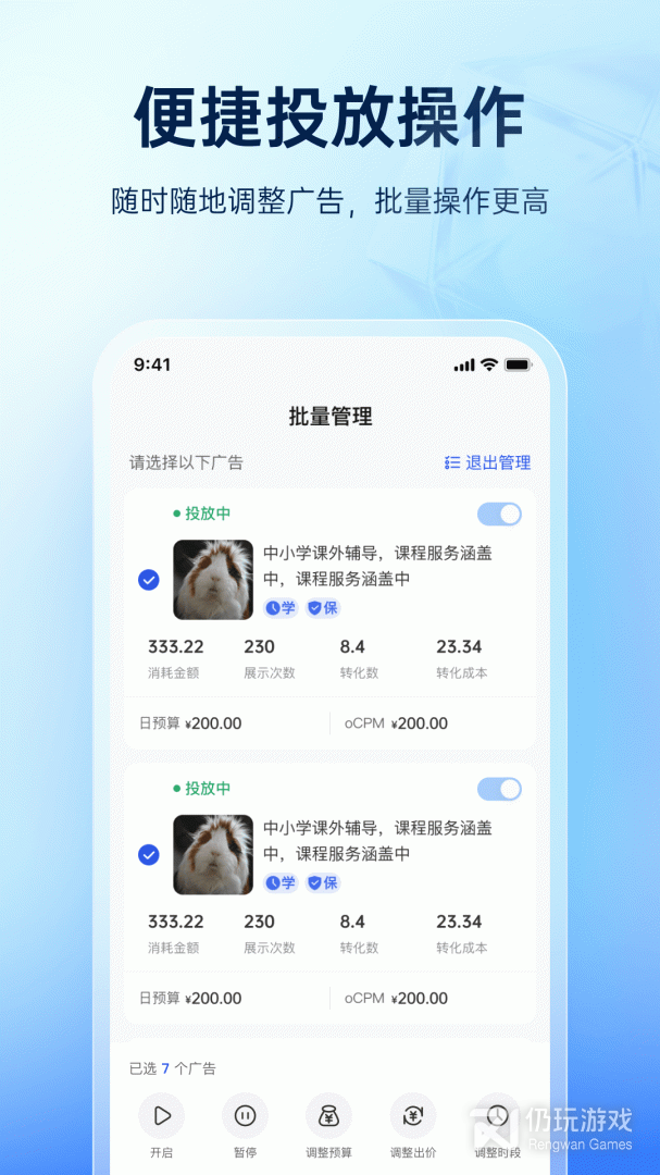 3. 广告修改:及时调整投放状态、出价、预算,修改投放时段、投放方式、用户定向等,没有电脑在身边,也可以及时把控广告投放。
