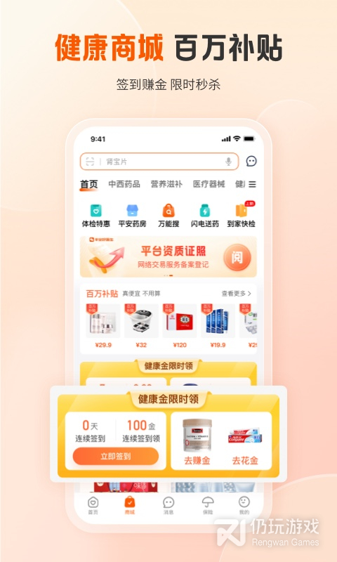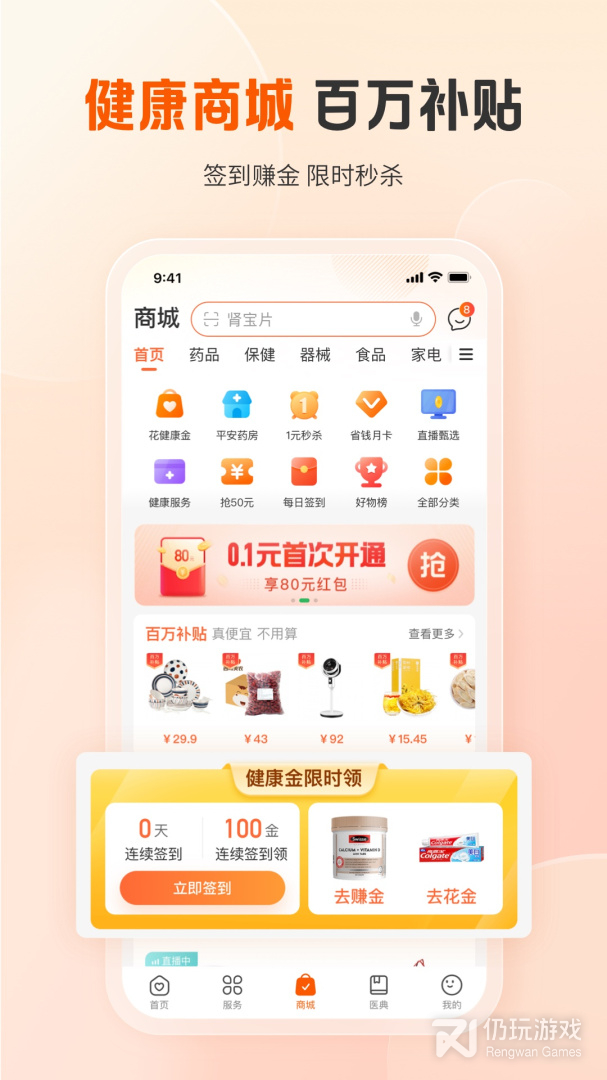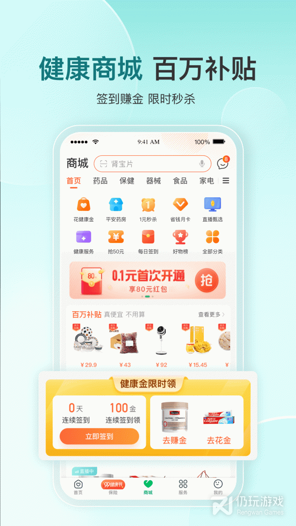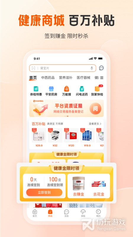 4、健康评测,我们使用了HealthKit同步健康数据,获取步数、卡路里信息,帮助您了解您的健康风险;运动计步奖励,每天记录运动步数,步数换积分,立走立赚,每一步都是为您的健康投资