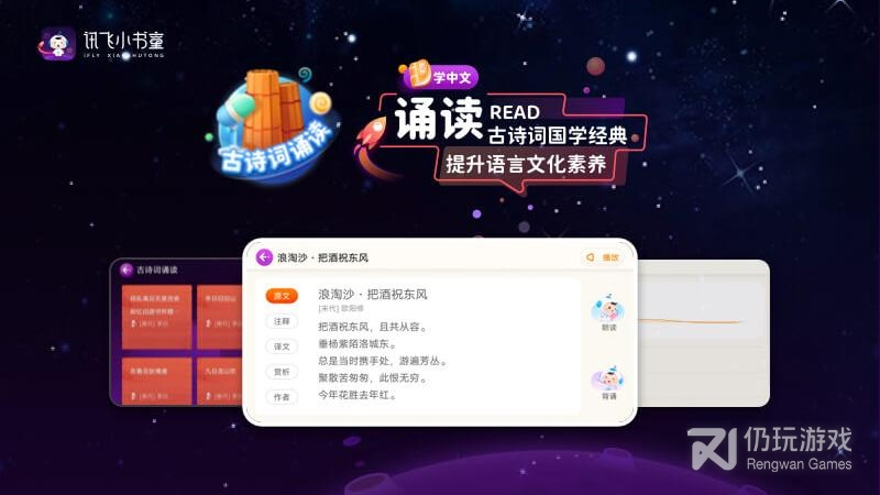(2)诵读的部分“古诗词诵读”是:古诗词真人标准音示范,提高语言文学素养。诵读积累语言,学习凝练用词。