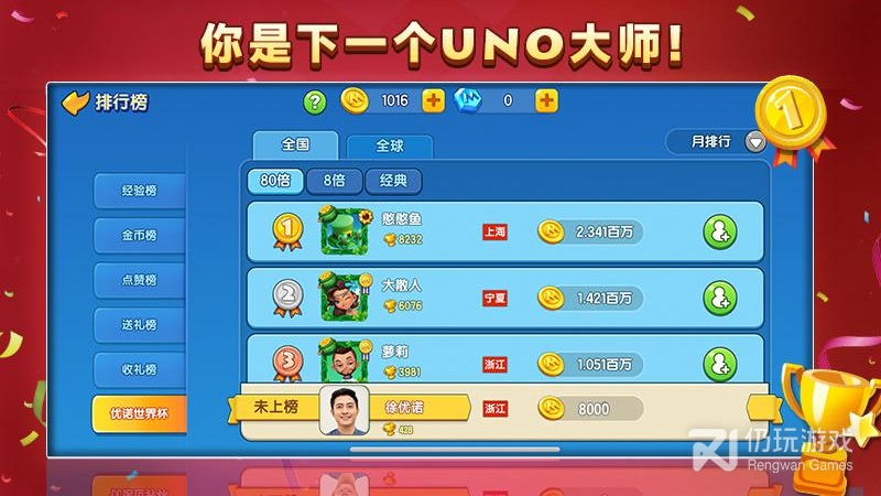 游戏现已开启“UNO世界杯”玩法,全球204个国家和地区的玩家参与,中国区第一名将代表中国出战全球排行。一旦成绩优秀,将触发全服奖励,关注谁能为这无上荣誉而战!