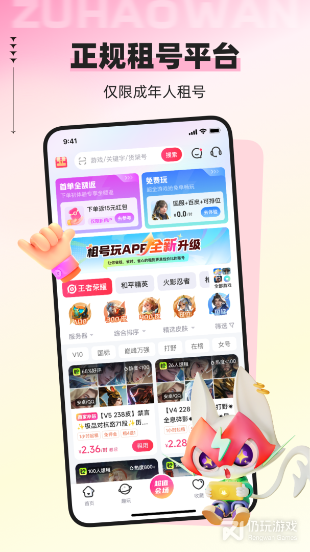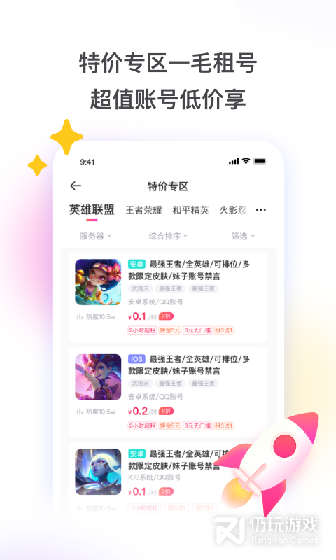 2、租号玩是一款专业为用户提供账号租赁服务的辅助软件,在这里你可以自由进行搜索找到你需要的游戏内容然后租到你需要的账号进行游戏,免去了你买号的大成本并且还能让你安心玩上游戏,同样软件会为用户保护自己的账号安全防止盗号。