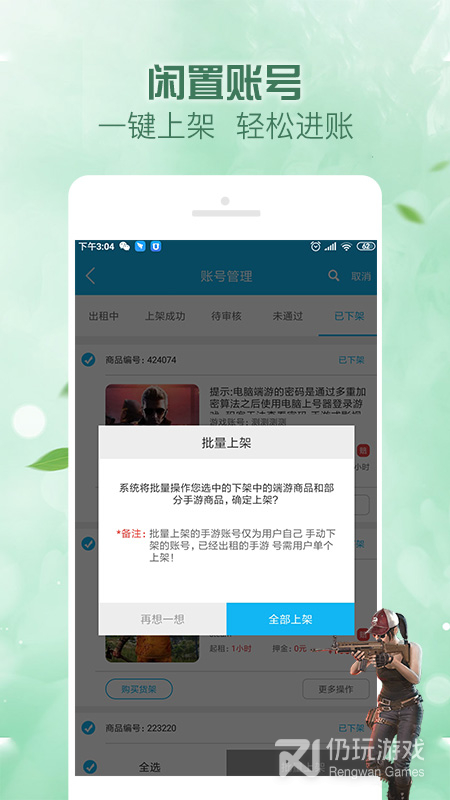 人人租号是一款安全可靠的账号租赁手机软件,平台上有各种火爆游戏的账号可以出租,账号数量多,质量高,价格还便宜,如果你没有时间,还可以把你的账号放在平台上来获取收益