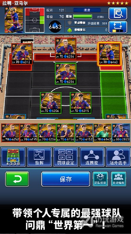 1、球员只有在适应位置才能发挥全部能力,如果把一一个5星的前锋球员放在后卫的位置上,他实际加成的战力还不如一个4星后卫,所以安排对位置也很重要,初期不会配可以自动编制。黄色代表门将,蓝色代表后卫,绿色代表中场,红色代表前锋,整个一个队伍加成也来也是挺可观的。