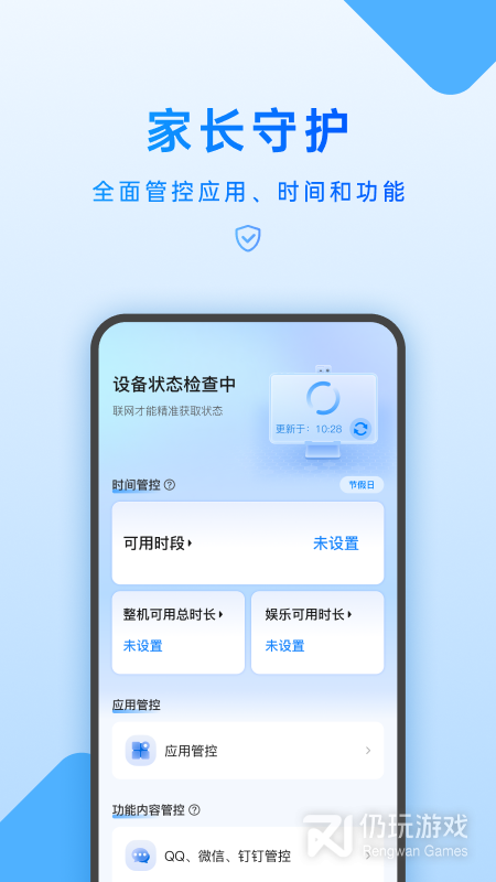 应用管控:可管控孩子下载应用、已安装应用是否允许使用、娱乐应用时长时间