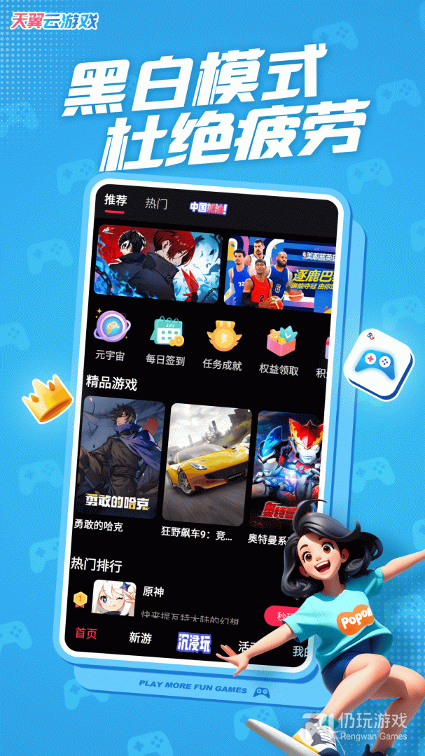天翼云游戏是一款方便玩家畅玩各类手机游戏的应用,天翼云游戏聚集超多酷炫游戏,喜欢什么类型都能直接点击在线玩,天翼云游戏还有丰富的游戏任务等你。是一款为玩家精心打造的提供全网络接入、高清内容、多终端沉浸式体验的云游戏平台,让游戏玩家利用5G等高速网络,通过即点即玩的方式,免下载免安装,畅玩各类手机、主机优质游戏,随时随地快速便捷地体验游戏乐趣。