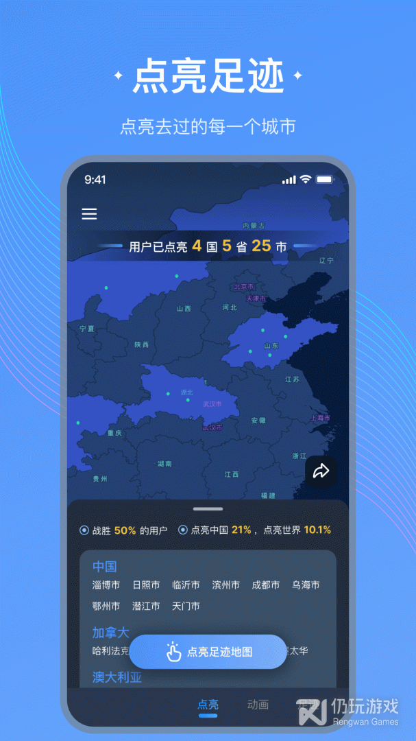 4、记录出行的点点滴滴,足迹地图可以自动生成足迹记录,记录你去了多少个国家、省份、城市,制作一个足迹地图分享给朋友