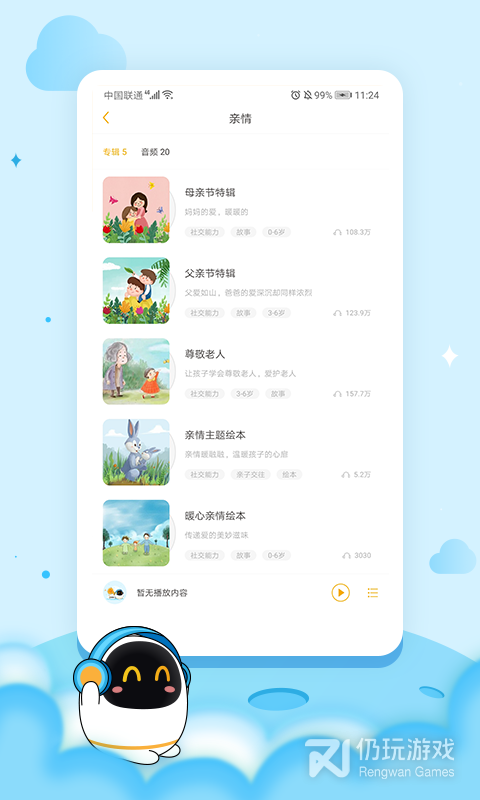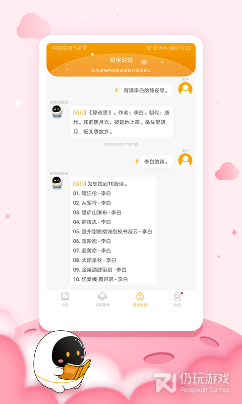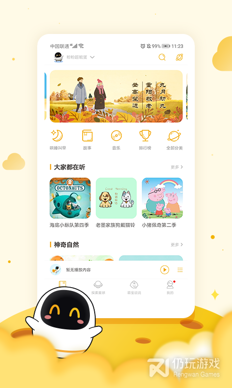 3、阿尔法蛋是一款非常不错的智能机器人学习软件,用户可以跟配套的设备在一起使用,平台上面功能多多,成语、故事、音乐等各方面的学习资源也很丰富,还有远场唤醒、视频通话、语音点播等功能,轻松陪伴孩子的学习,喜欢的快来体验吧
