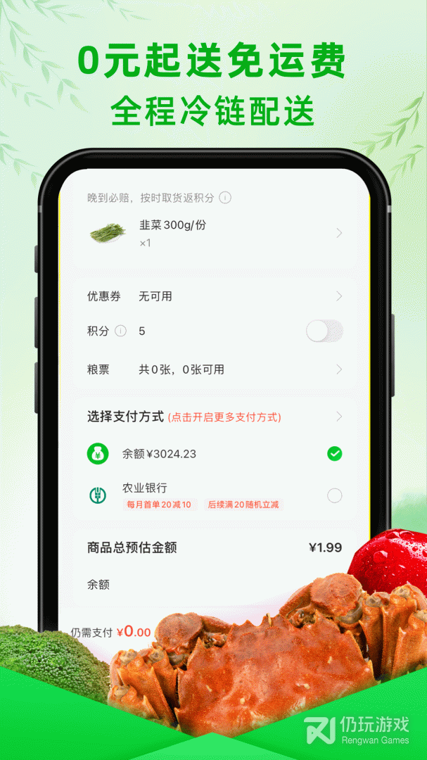 1、小时不限时订购生鲜食品,多种方式进行支付,方便快捷
