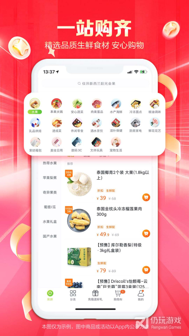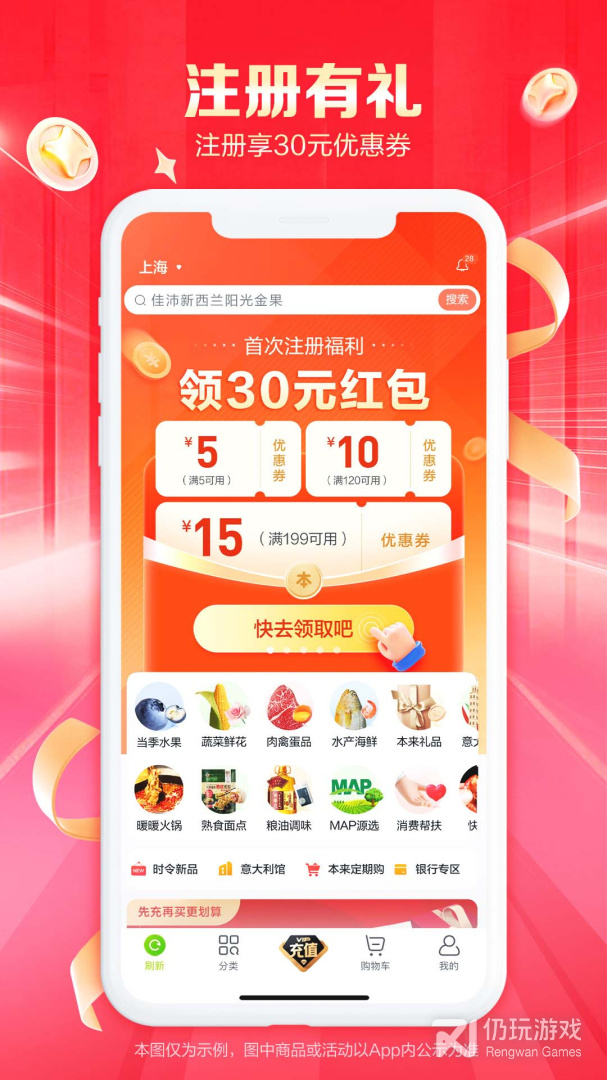 肉禽蛋品、水产海鲜、烘焙速食、粮油副食、零食酒水、乳品母婴、厨房用品等商品。