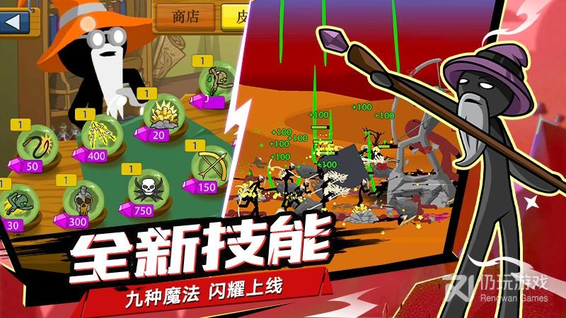 1、收集黄金去升级你的盔甲,防御,武器和技能,招募更多不同性能的火柴人