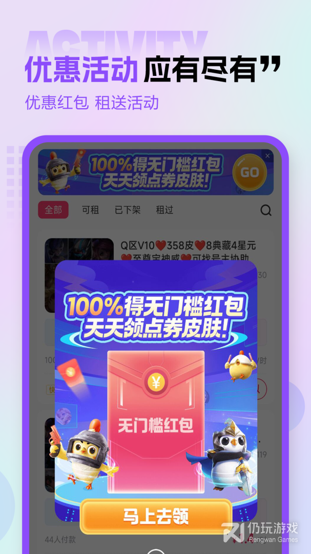 2、租号玩为每一个用户提供了首次注册的奖励可以轻松获取一个减额红包让用户在租号的时候直接使用同时还有超多不同的活动以及福利等你来拿,软件也有秒杀折扣专区让你低价租号,享受大神账号的尊贵体验
