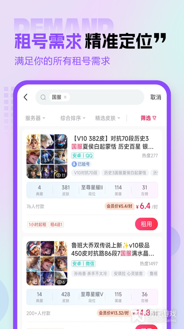 4、租号玩是一款专业的账号租借服务平台,提供各种热门网络游戏和手游账号出租,玩家只需花上极少量金钱就可以体验顶级装备刷图的快感,非常适合那些想玩又舍不得花钱的用户