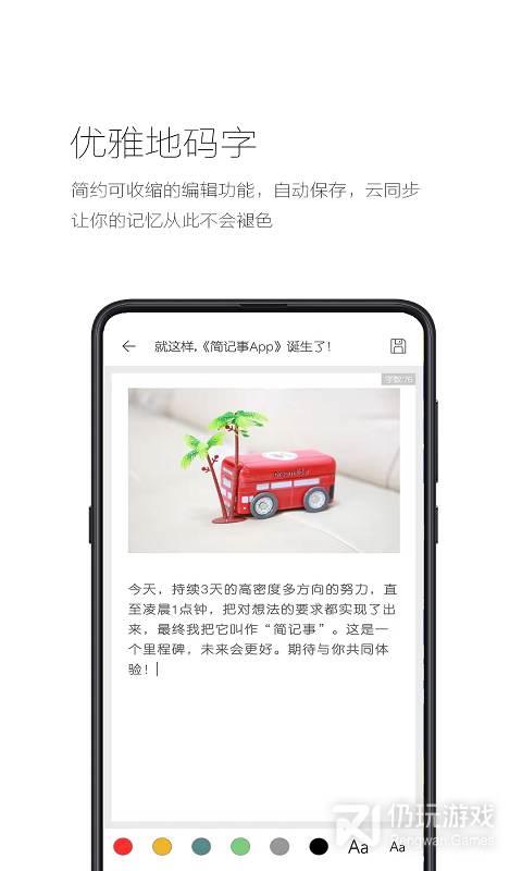 2、优雅地码字:优雅的编辑功能,让您的记录缤纷多彩,一键保存,让您的记忆从此不会褪色。