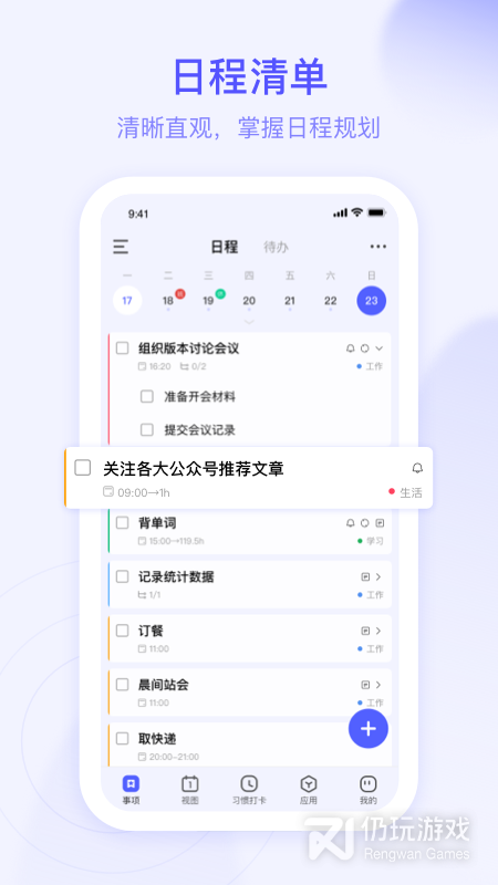 4、一个能让你做好时间规划的手机应用软件。在该软件简约,小清新的界面中,你可以为自己定制一个小目标,并每天进行打卡坚持,告别拖延。另外你更能用它进行高效规划自己的任务和时间