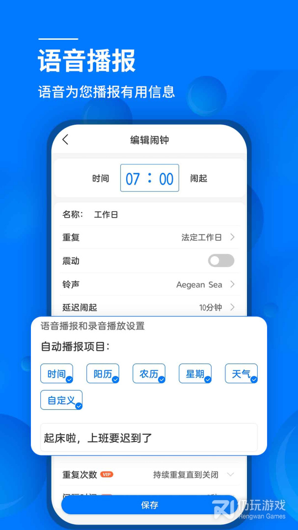 1、语音闹钟是一款十分实用的语音闹钟。用户可以在这里随时随地进行语音闹钟设置,按时提醒用户,让用户不再迟到,非常的方便,用户还能自定义播报内容,独特播报更有趣