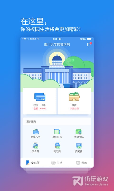 校园安心付app是一款校园生活应用。用户使用校园安心付app能随时充值饭卡,轻松缴纳补考费,学费等,更有消费账单查询,让你更好的规划你的校园财务,实时为大学生们提供校园卡服务,一卡通更便捷,金额可以自定义,操作简单,需要就来使用吧。