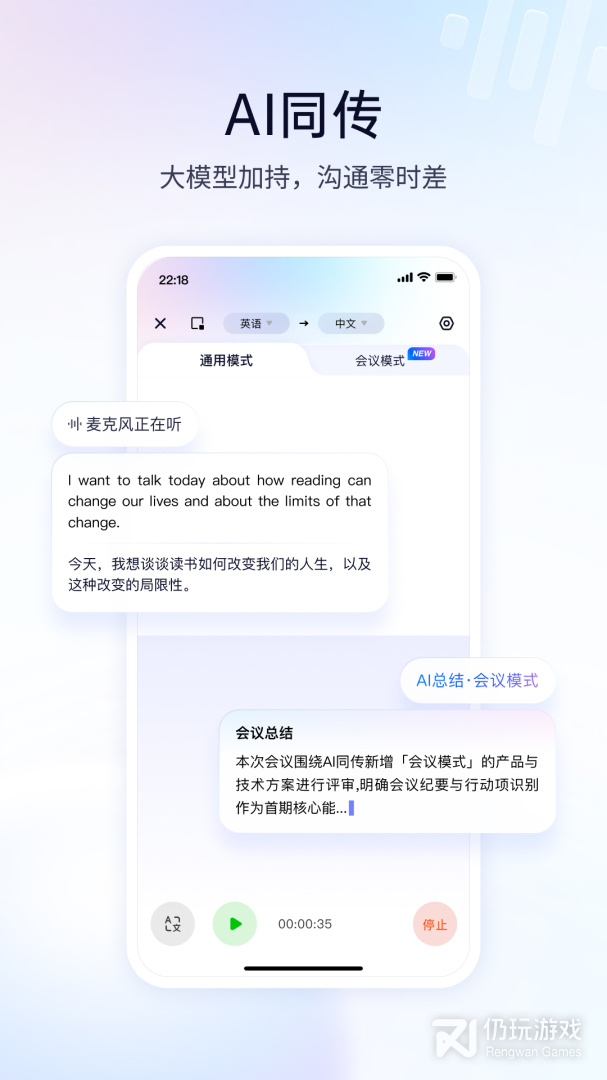 1、AI同传能力升级:大模型区分会议模式与通用场景,适配不同使用需求;新增会议模式AI智能总结,快速提炼关键信息。