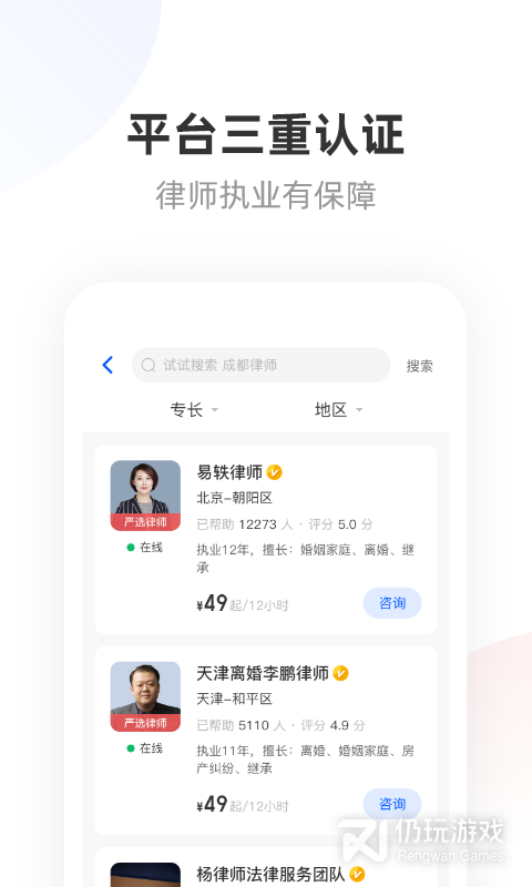 4、找律师用户也可以按照地区以及不同业务找寻想要咨询的律师服务,进行付费咨询