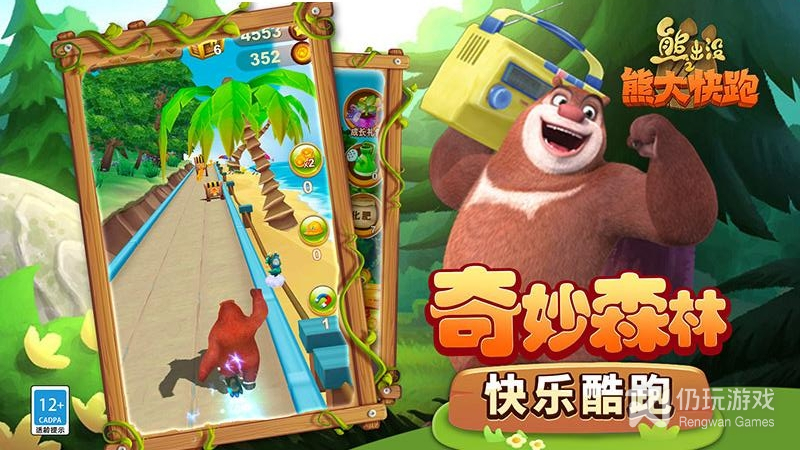 1、熊出没之熊大快跑,卡通绘制游戏画风,生动的游戏场景和人物形态,结合跑酷的游戏玩法,去收集更多的金币,获得强大的道具让你跑出更远的距离,还可以解锁独特华丽的服饰进行穿戴