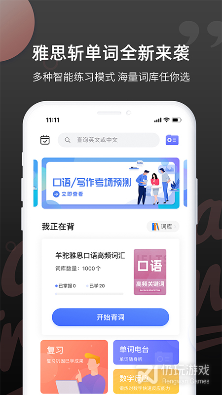 1、雅思斩单词提供的练习方式非常智能而且有效,在这里你可以选择、听英文写单词、听英文读英文等方式,让学习单词通过多维度的模式而变得记忆深刻,软件内的题库非常丰富,有专门针对听说读写的题库,也要根据雅思分数划分的题库,你可以逐步进阶