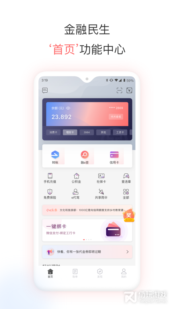 工行服务智能提醒:根据您在我行的资产状况,为您智能推荐低风险理财产品,随时查看信用卡账单和还款信息