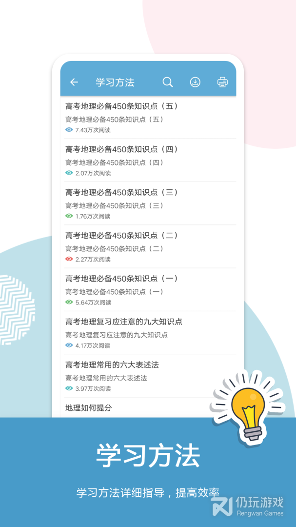 1、高考地理通是一款地理知识学习软件,能够为高考考生提供全面的地理知识及历届的考试真题卷,涵盖范围广,知识讲解全面,是考生快速提高地理成绩的好帮手。赶紧来下载体验呗