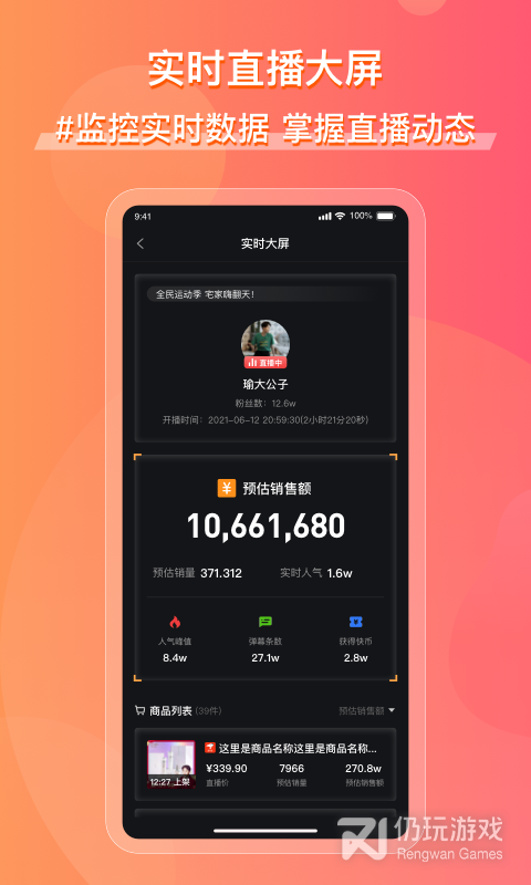 3.直播实时大屏秒级更新,动态展现直播间数据变化,让你时刻掌握直播间带货动态。