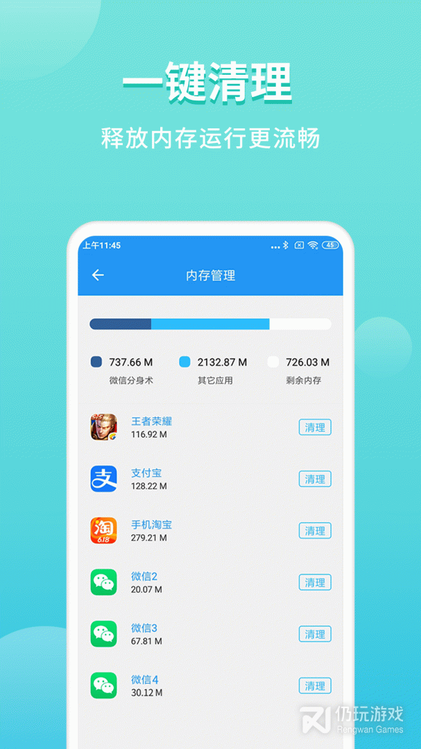 2、全球首创应用多开功能,依托双开助手自有的内存管理机制,手机无限多开不卡顿