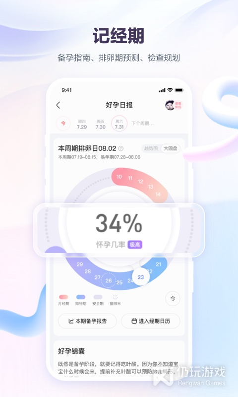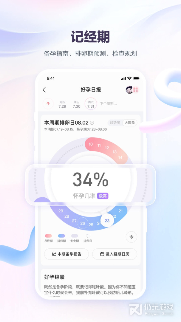 5、怀孕状态:随时提醒您当前的怀孕状态,让您知道还有多少天就要和宝宝见面了。每个孕周会有新的提醒,通知您查看本周状态。每天打开应用,都有今天的推荐知识,本周重点提醒等