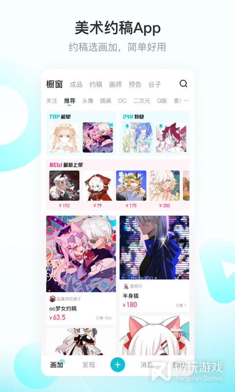 1、画加是一款非常实用的手机约稿服务应用软件,在这里用户可以看到很多画师的作品,也可以分享自己的作品,同时还可以与其他的商家进行约稿赚钱,无手续费