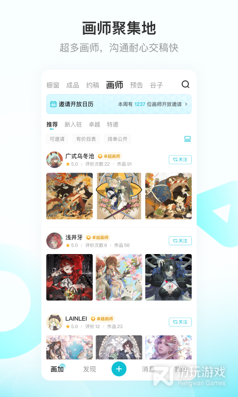5、由网易打造的一款约稿平台画加带给大家,这款软件中有着很多的画师,还有大量的绘画订单,大家可以在这里自由接单,接单后还可以在线与客户进行绘画的沟通,赚取一定的稿费,此外这里还可以与其他用户一起交流绘画经验哦