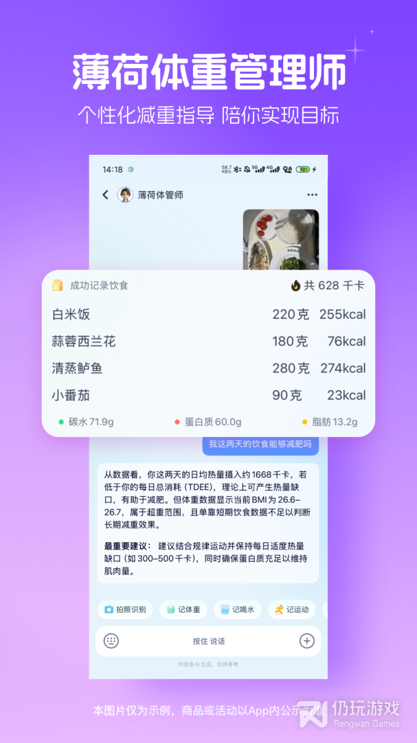 -记录更轻松:一句话速记饮食、体重、饮水与运动等;