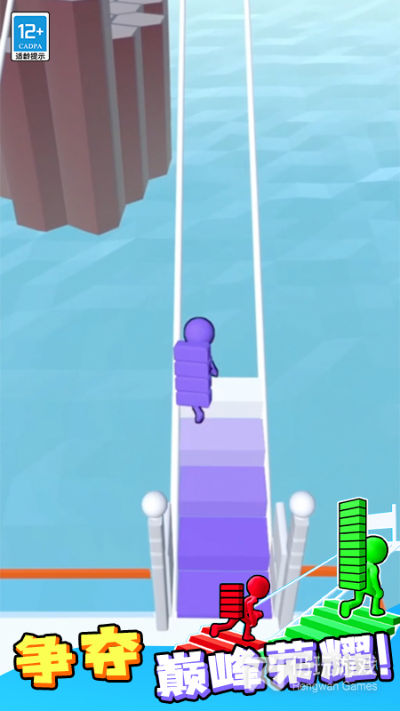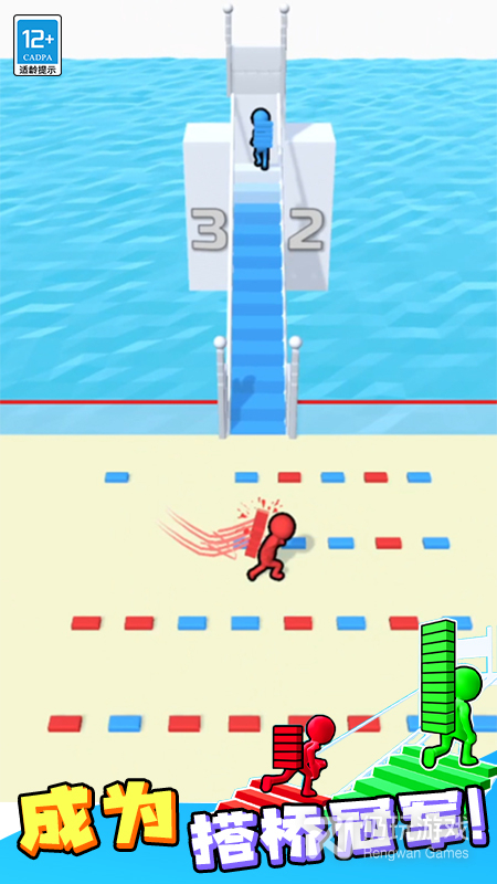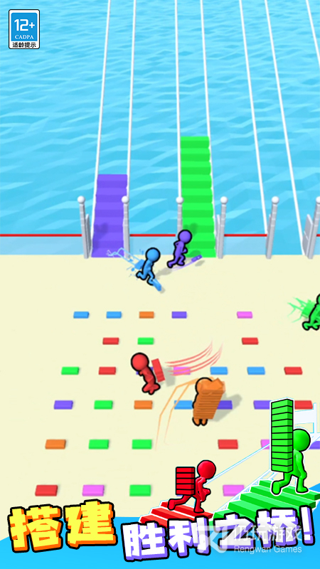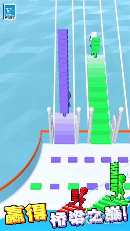 3、搬砖争霸赛是一款非常好玩的冒险闯关类手机游戏,游戏画风独特,内容丰富,玩起来简单轻松,在游戏中玩家需要根据自己的颜色来进行收集搬砖搭桥到底终点,非常适合打发时间。